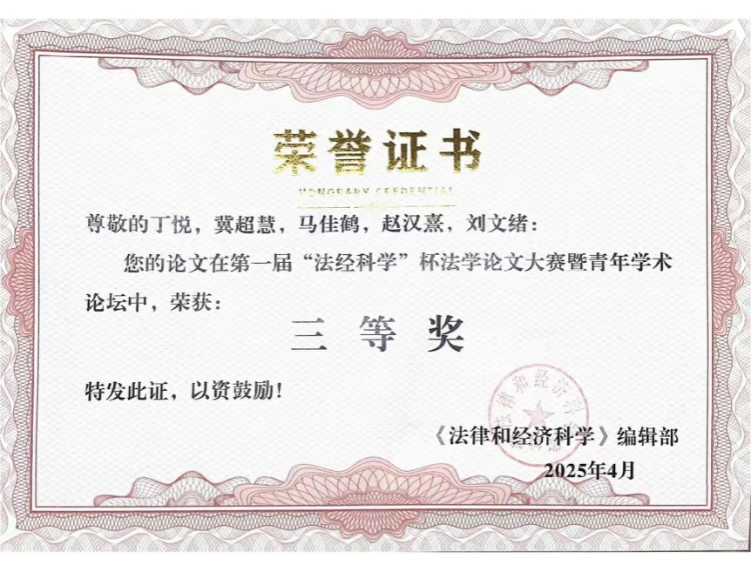 日前,四川省法学会律师法学研究会与《法律和经济科学》编辑部联合举办的第一届“法经科学”杯法学论文大赛暨青年学术论坛公布获奖名单,我院2022级本科生作品获得三等奖。