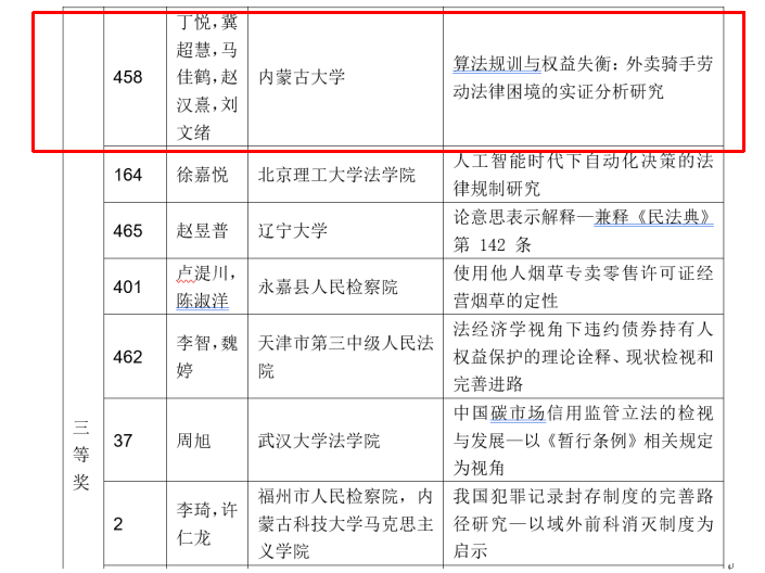 第一届“法经科学”杯法学论文大赛暨青年学术论坛于2024年12月2日发布征文公告,至2025年3月16日征文截止。期间,组委会共收到投稿论文556篇,经认真评选,共选出获奖论文62篇(占比11.15%),其中我院2022级本科生丁悦、冀超慧、马佳鹤、赵汉熹及数学与应用学院数学专业2022级本科生刘文绪,马克思主义学院马克思主义理论2023级本科生李梦迪,民族学与社会学学院社会学专业2021级本科生朱志鹏的作品《算法规训与权益失衡:外卖骑手劳动法律困境的实证分析研究》获得三等奖。