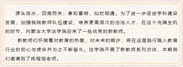 段程旭,出生于巴彦淖尔,长在鄂尔多斯,博士毕业于西北政法大学,主要研究方向为民商法、环境保护法。博士期间发表6篇核心期刊论文,其中3篇为CSSCI来源期刊,参与国家社科基金项目一项。