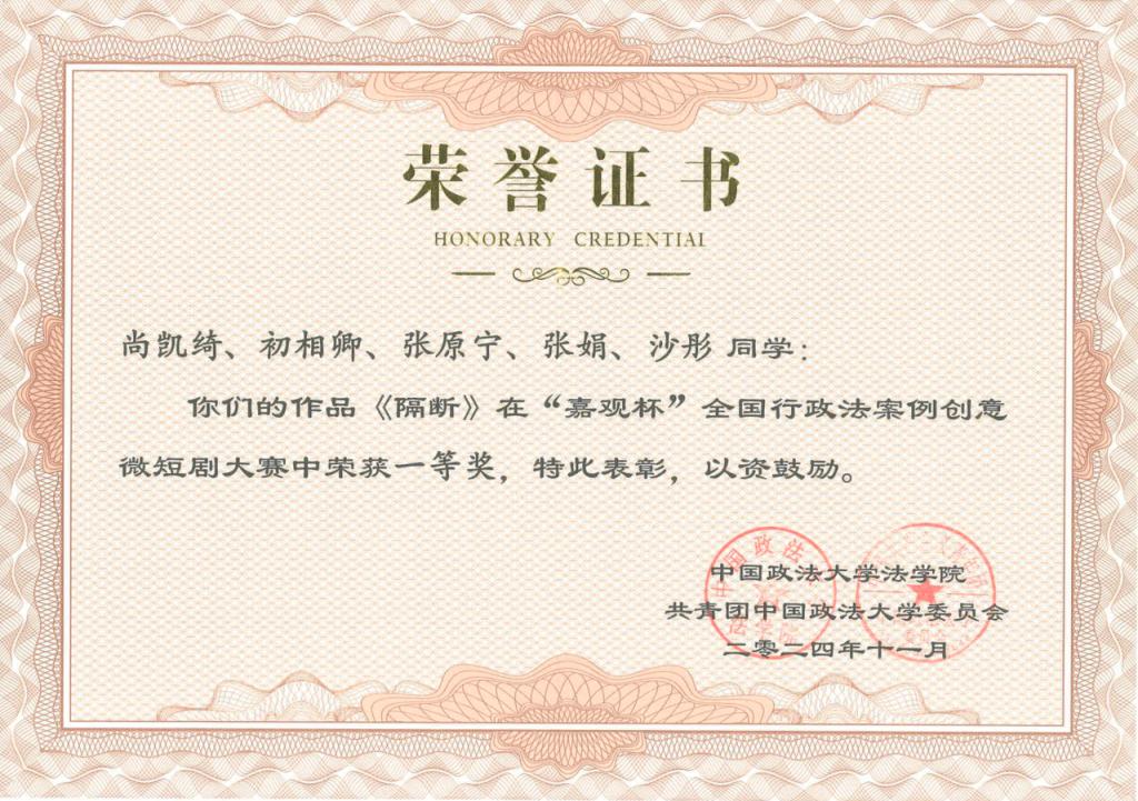 11月17日,由中国政法大学tyc8722太阳集团、共青团中国政法大学委员会主办的“嘉观杯”全国行政法案例创意微短剧大赛颁奖典礼暨卓越行政法治人才实践能力培养虚拟教研室教学研讨会在中国政法大学海淀校区闭幕。我院代表队的参赛作品《隔断》获评一等奖(第一名)。