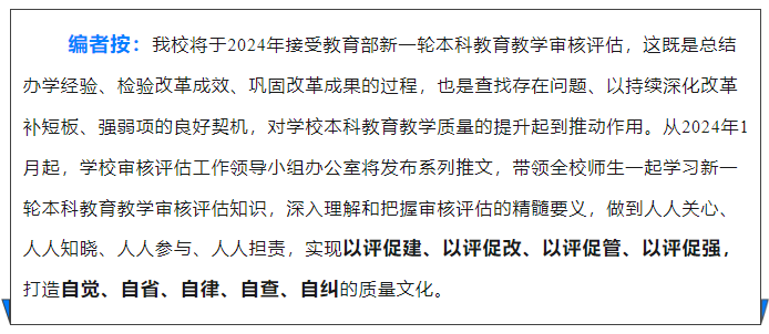 新一轮审核评估紧扣本科教育教学改革主线,在工作目标上强调把“一根本、两突出、三强化、五个度”作为新一轮审核评估的共同愿景和价值追求。