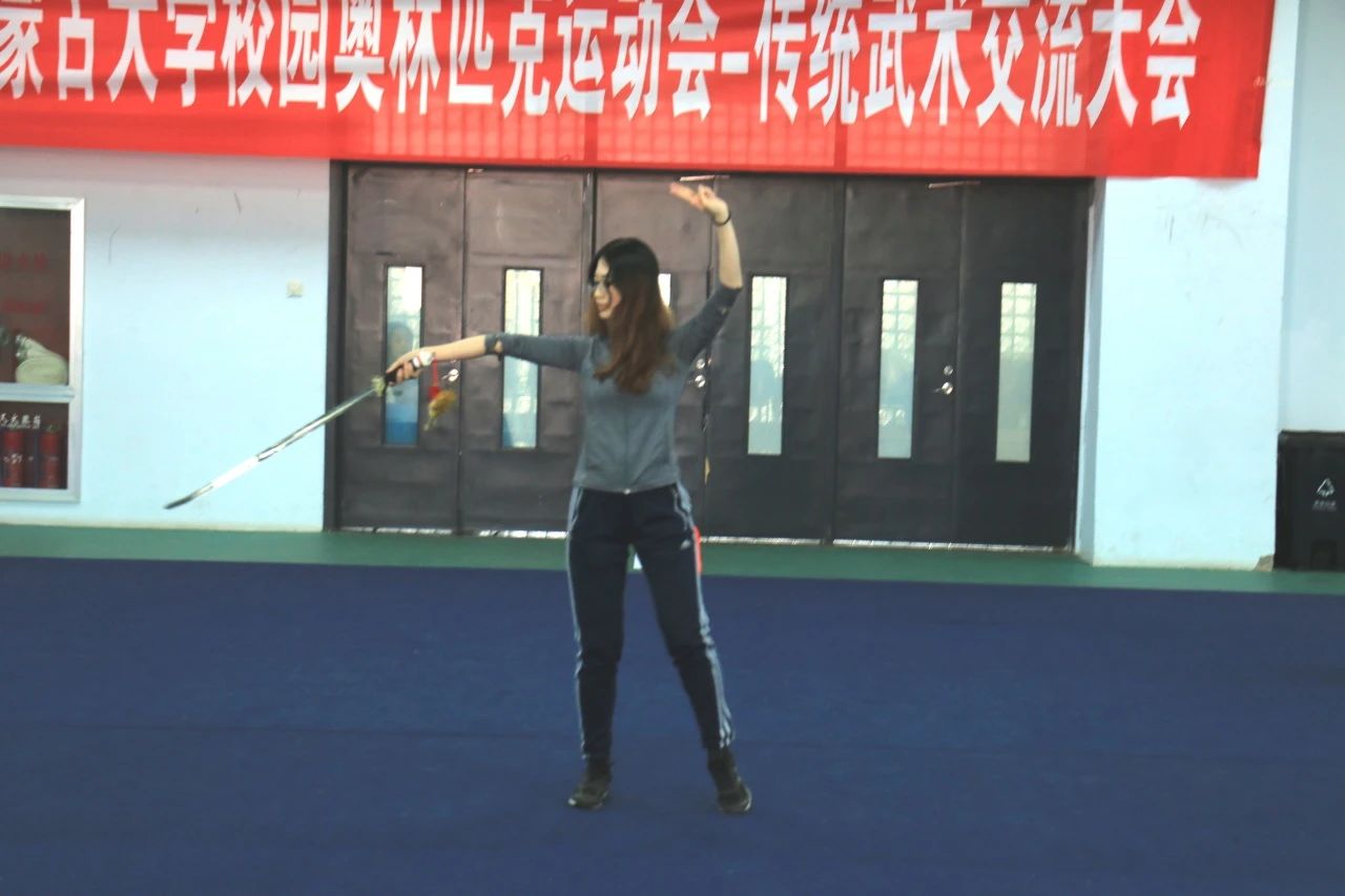 乌日汉同学展示的项目是“初级剑术”。该项目融合了太极拳的轻灵柔和与剑术的优美潇洒。她运剑成风,动作行云流水。