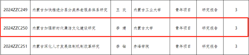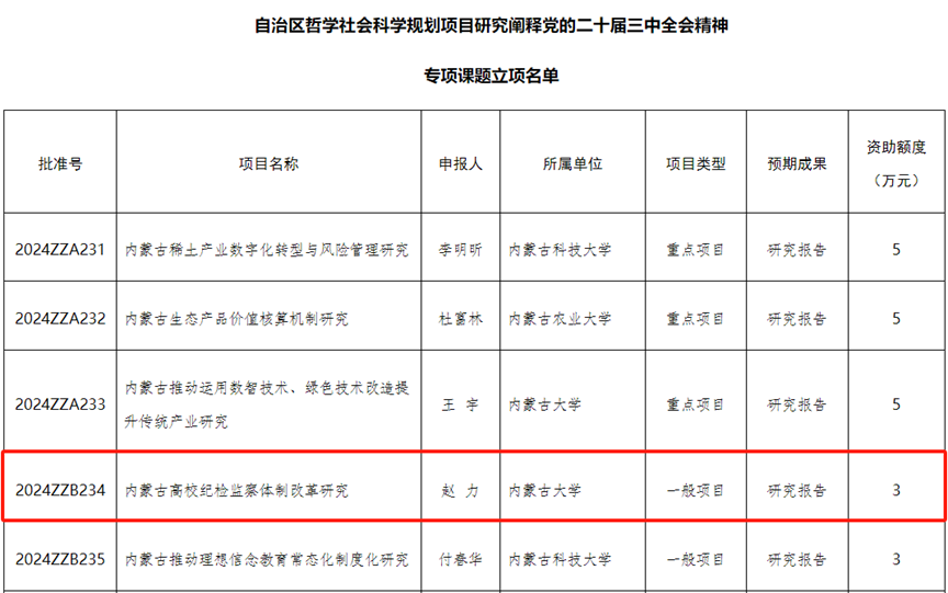 2024年12月18日,内蒙古社科规划网发布了《关于印发自治区哲学社会科学规划项目研究阐释党的二十届三中全会精神专项课题的通知》,公布了自治区哲学社会科学规划项目研究阐释党的二十届三中全会精神专项课题立项名单,我院教师赵力申报的《内蒙古高校纪检监察体制改革研究》获批一般项目立项,李婧申报的《内蒙古加强新时代廉洁文化建设研究》获批青年项目立项。