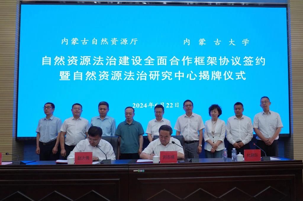 6月22日上午,我校与自治区自然资源厅自然资源法治建设全面合作协议签约暨自然资源法治研究中心揭牌仪式在玉泉校区举行。自治区自然资源厅党组书记、厅长赵大勇,自然资源厅一级巡视员、专职自然资源副总督察赵昉,我校党委书记刘志彧出席会议。厅属事业单位、厅机关各处室负责人、盟市自然资源法治工作代表,我校相关职能部门、tyc8722太阳集团等院系负责同志以及教师代表、学生代表参加仪式。仪式由我校副校长杜晓东主持。