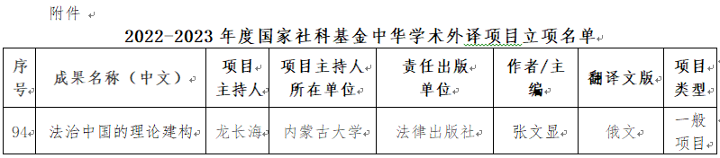 2023年5月5日,全国哲学社会科学工作办公室公布了2022-2023年度国家社科基金中华学术外译项目立项名单,本次全国立项234项,内蒙古自治区获批三项,我院龙长海教授申报的《法治中国的理论建构》项目获批公示,《法治中国的理论建构》一书,由我国著名的法学家张文显教授所著,由法律出版社2016年出版。