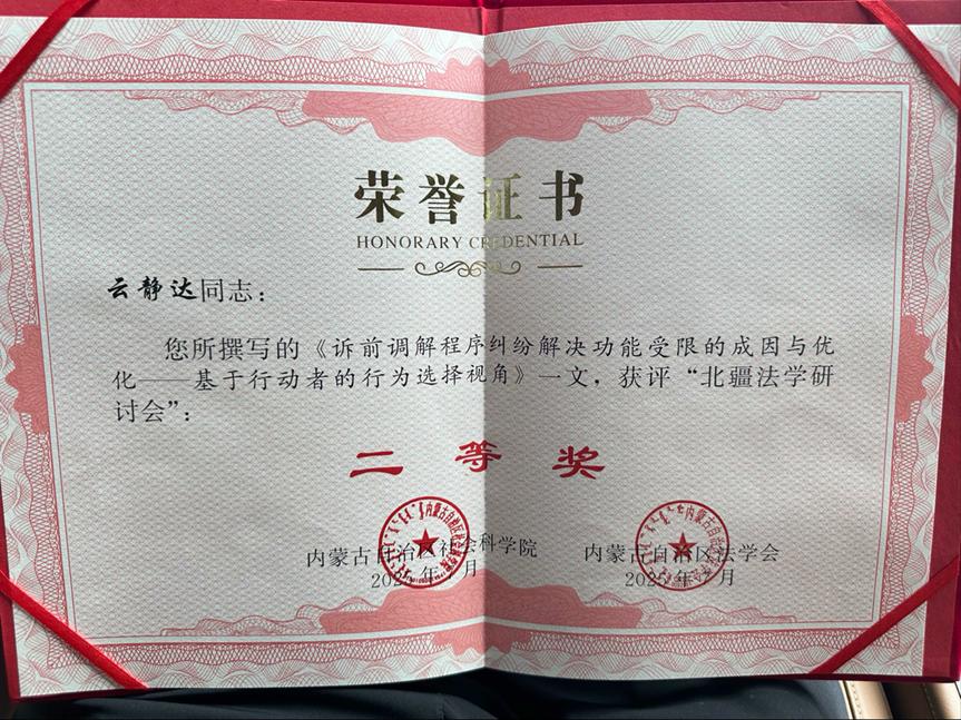 tyc8722太阳集团副院长张慧春、纪检监察学院教授那仁朝格图和讲师云静达参加会议。那仁朝格图教授以《中华法系北方民族多语种法律文献及其价值》为题作主旨发言,云静达老师以《诉前调解程序纠纷解决功能受限的成因与优化》为题进行交流发言,该成果获“北疆法学研讨会”二等奖。