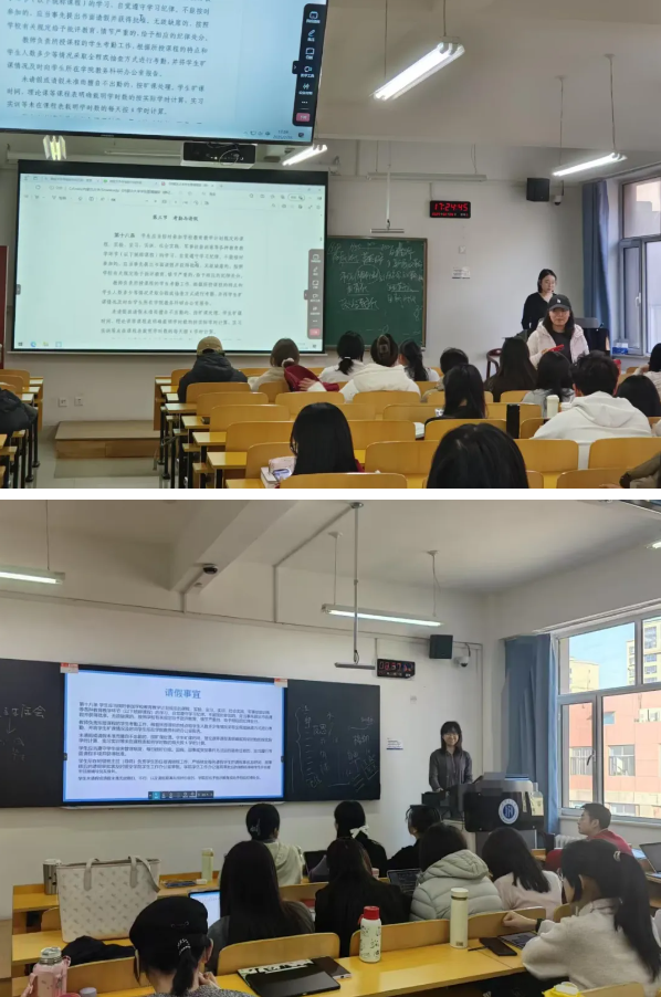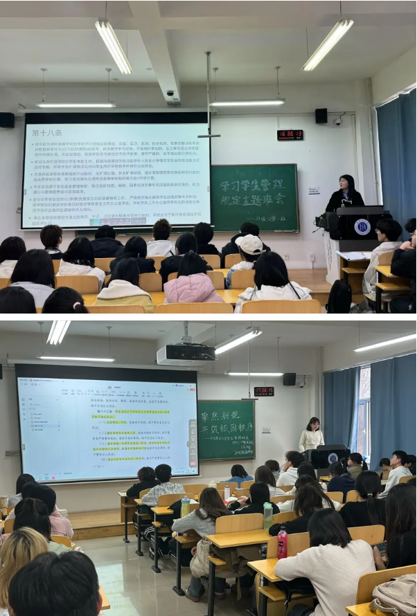 为强化同学们的遵规守纪意识,我院各班围绕《太阳集团城娱8722学生管理规定(修订)》开展了主题班会活动。聚焦宿舍管理、请销假制度等内容,通过PPT讲解、案例分析和互动答疑等形式,帮助学生全面掌握新规。