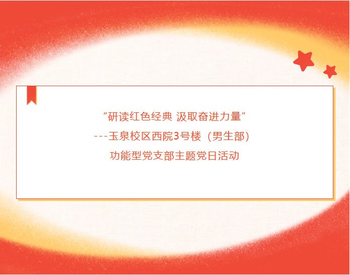为进一步增强楼宇功能型党支部的凝聚力和思想政治建设,推动“党建+思政”育人工程建设,发挥一站式学生社区育人实效,玉泉校区西院3号楼(男生部)功能型党支部于2月24日在玉泉校区西院一站式学生社区党建活动室开展了“研读红色经典 汲取奋进力量”主题党日活动。此次活动由马克思主义学院宋春霞老师担任主讲,3号楼(男生部)功能型党支部书记白丹、副书记布和、社区部分党员参加活动。