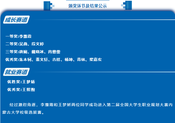 通过本次职业规划大赛,同学们拓宽了职业视野,树立了正确的成长成才观和择业就业观,提升了就业竞争力,为科学合理规划自己的学业与职业发展提供了方向。大赛虽已落幕,征程未有穷期,希望大家能在未来的就业道路上不断挖掘自身潜能,再展青春风采!