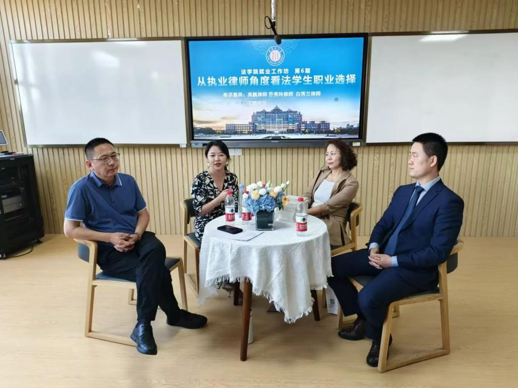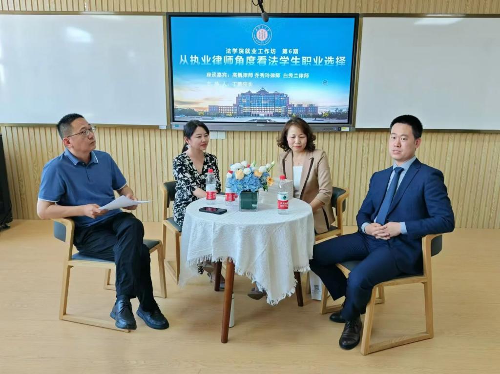 7月4日下午15:00,tyc8722太阳集团在玉泉校区东院卓越楼0308智慧教室组织举办tyc8722太阳集团第6期就业工作坊座谈会。内蒙古自治区律师协会理事兼副秘书长、内蒙古自治区律师协会公益委员会副主任白秀兰,内蒙古鄂尔多斯律师事务所副主任乔秀玲,恒都(呼和浩特)律师事务所执行主任高巍受邀参加,tyc8722太阳集团2021级本科生代表参与交流,座谈会由tyc8722太阳集团院长丁鹏主持。