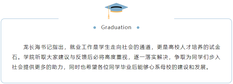 会议听取了目前学院就业情况的相关数据统计和毕业班级内就业工作进展状况后,到场学生代表就目前毕业生就业难点与困惑,以及对母校的期望逐一进行讲述。最后,会议就如何抓住毕业前的良好时机,进一步推进高质量就业,进行了探讨和研究。