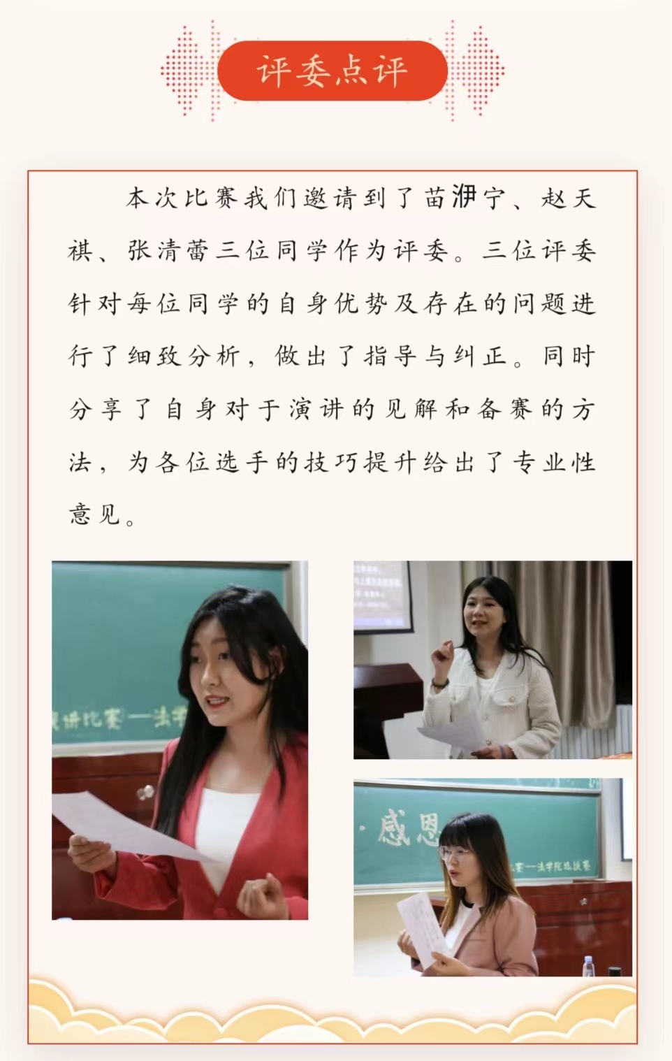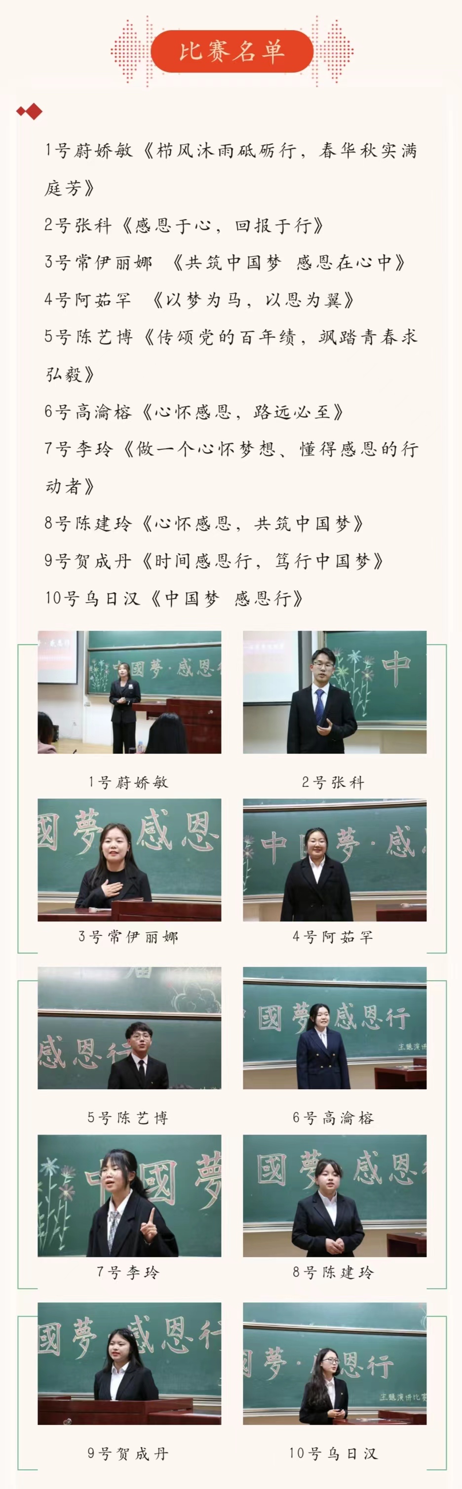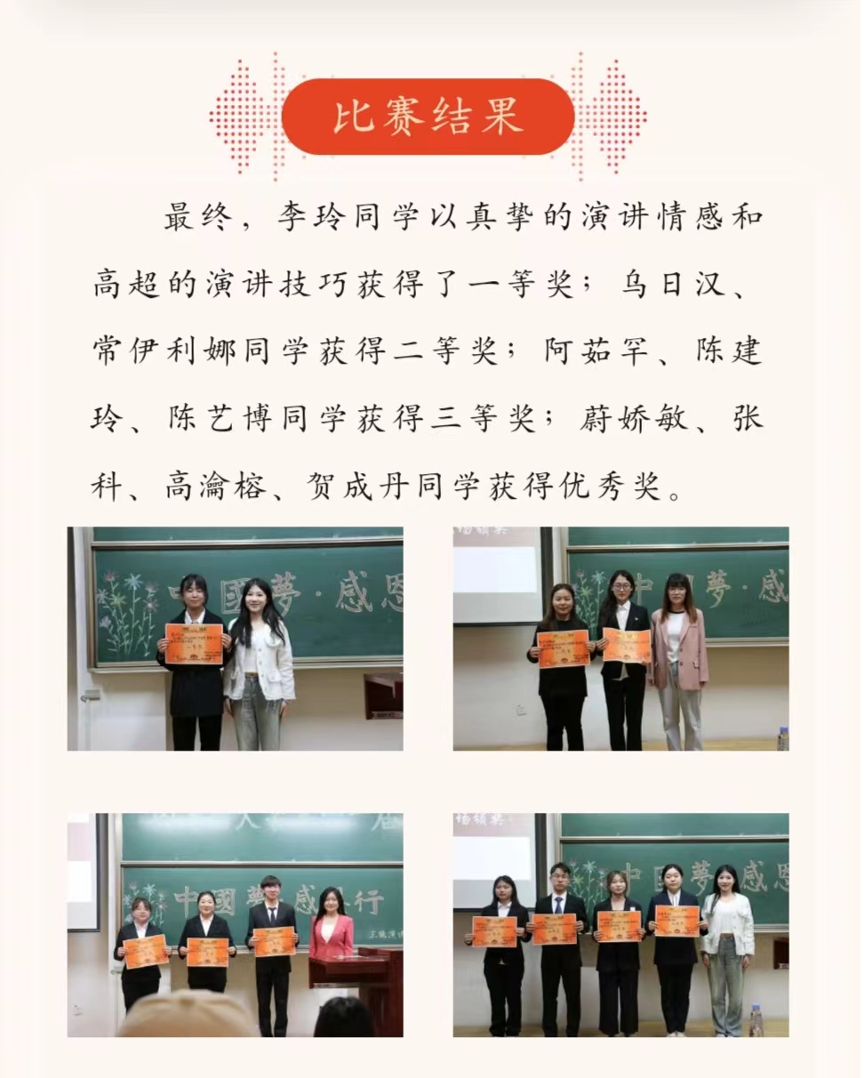 本次“中国梦·感恩行”主题演讲比赛圆满结束。选手们在比赛中收获了评委的针对性点评、在实战中磨炼了技巧,提升了自我水平。让我们心怀感恩、共同前行、团结奋斗,铸牢中华民族共同体意识,并将个人梦想与时代梦想结合起来、共筑中国梦!