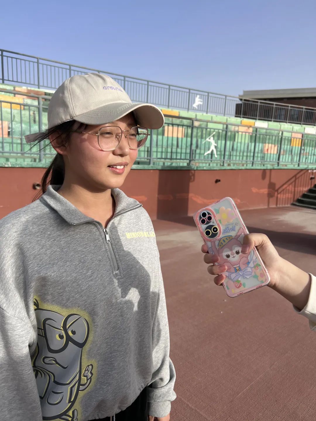 接下来接受采访的是参加100米和200米跑步的王照煦同学,她表示这是她在大学参加的第一次运动会,心里比较激动,同时也有一定压力。为了参加本次运动会,自己每天都会参加训练,多跑步来提升体能。她也认识到自己的肺活量存在不足,需要进行一些专项练习提高爆发力进而提高跑步速度,希望自己能在比赛中拿到一个好名次。