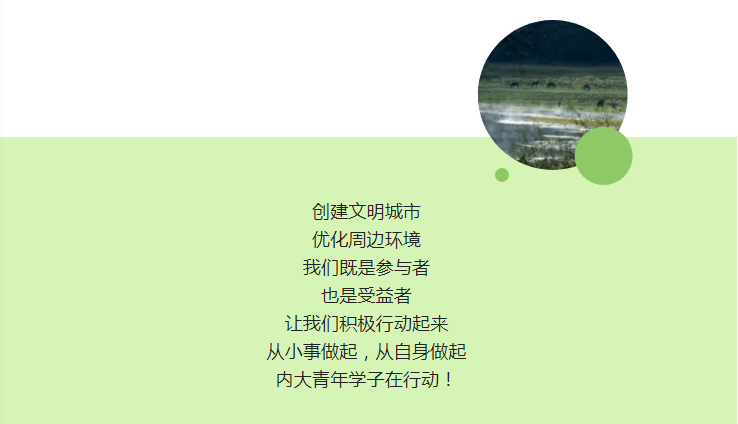 为积极响应呼和浩特市创建全国文明城市的号召,弘扬社会主义核心价值观,凝聚青年力量,担负时代使命,助力文明城市创建工作,增强内大学子社会责任感,tyc8722太阳集团向我院青年发起号召,鼓励大家身体力行,扎根实践,厚植城市荣誉感,投身到创建文明城市的伟大事业中来。