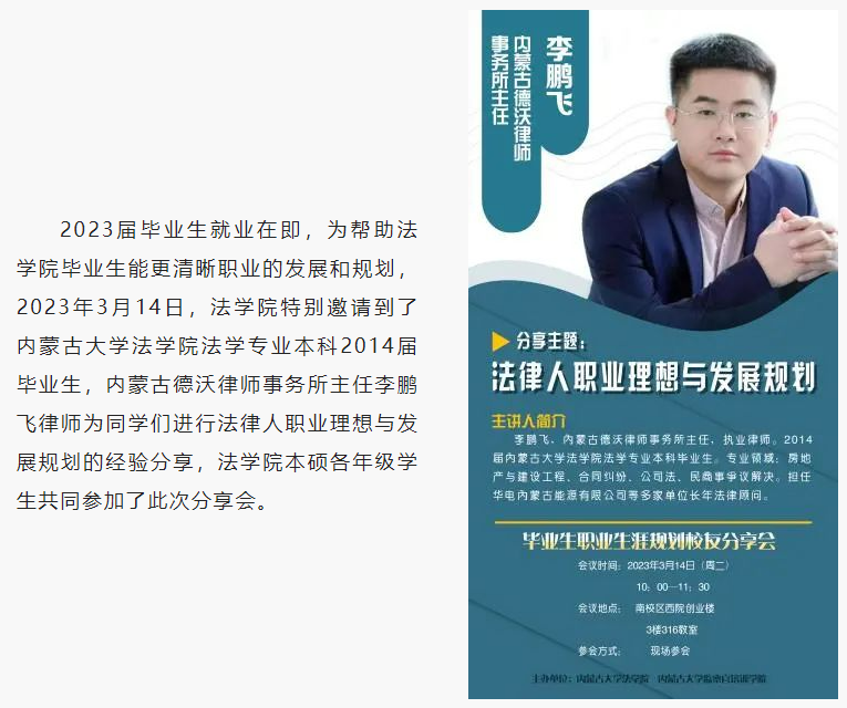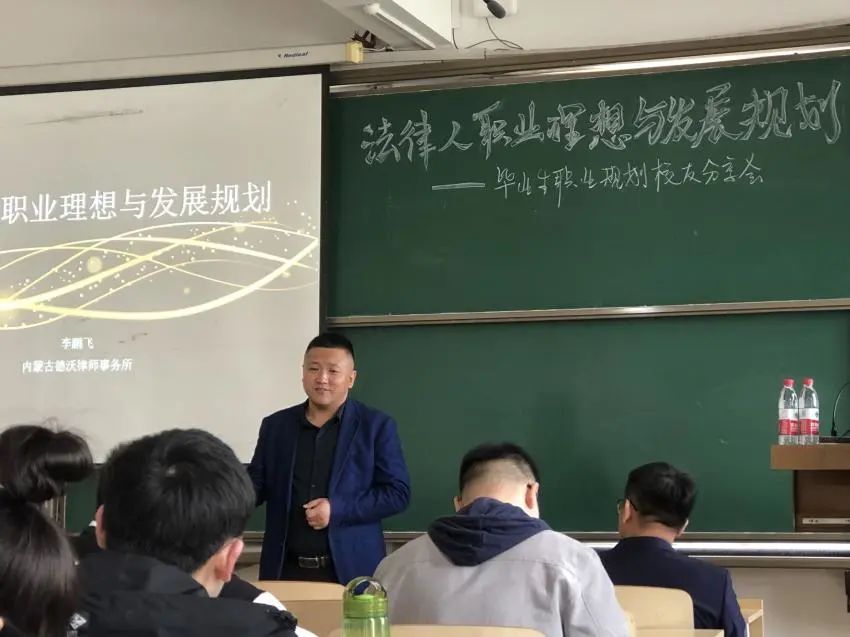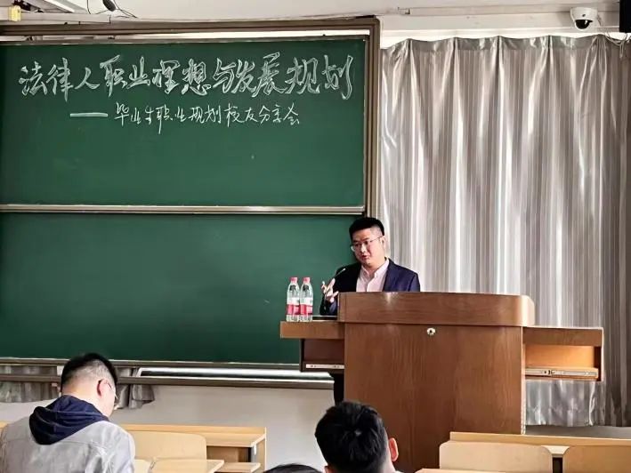李鹏飞律师从律师的未来发展、职业道德使命、工作时间、能力培养、薪资待遇等方面进行了详细介绍,帮助同学们理清选择律师职业的优势及传统误区,着重强调选择律师行业,对于个人能力的提升、职业发展晋升、维护法治道路的建设具有极大的助推作用。李鹏飞校友以自身从实习生成长为律所主任的职业经历为例,让同学们对律师职业有了更加深刻的认识的同时并给出了几点建议:一、同学们作出职业选择前要主动积极去了解,不盲目跟风。二、选择一份职业就是选择一种人生,同学们要遵循自己内心的真实想法,去深入了解认识自己,方能作出适合自己的最优解。三、要保持一个持续学习的习惯,对于个人能力的提升及以后职业的发展有着极大裨益。四、对于互联网对律师的片面看法、以及传统就业观念,同学们要不被外界因素所干扰,多去全方面辩证地思考,脚踏实地地去实践。