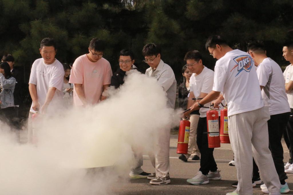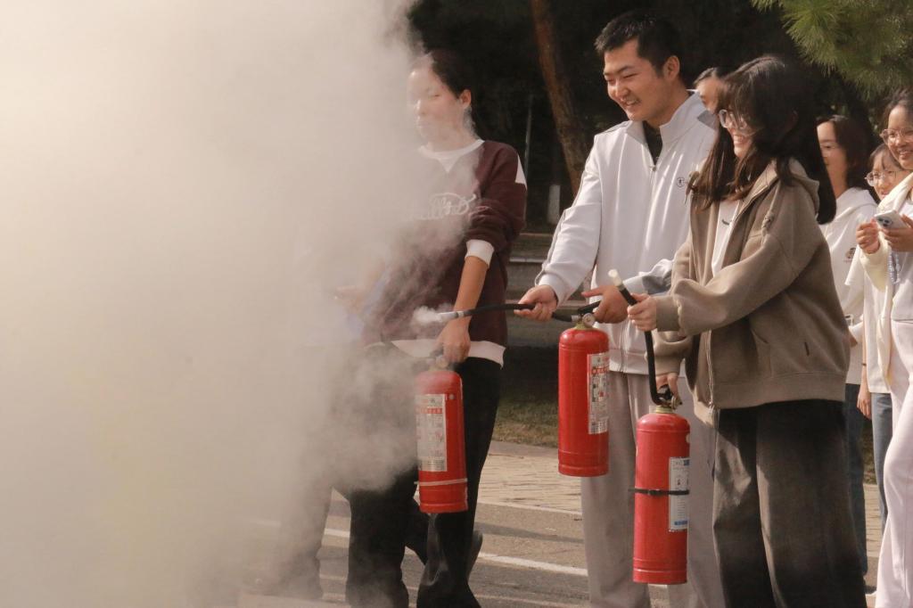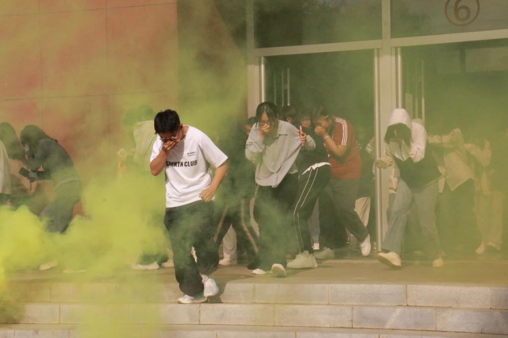 实战演练前,刘福忠老师先就疏散流程、安全注意事项进行简要讲解,为后续演练做好充分铺垫。当警报声响起,同学们在老师的引导下,迅速采取低姿弯腰姿势,沿墙壁快速有序通过安全出口,向指定区域疏散。整个过程紧张高效、秩序井然,有效检验并提升了大家的应急反应与现场处置能力。逃生演练结束后,刘老师现场演示灭火器操作流程与灭火技能要点,并指导同学们上手实操,确保每位同学都能掌握正确操作方法。