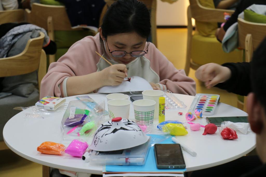 在“绘梦小铺”,同学们全身心沉浸于面具创作,在解压放松中探索自我、表达自我。空白面具在大家的妙笔下焕发生机——或绘上色彩斑斓的春光,或勾勒黑白的纹路。