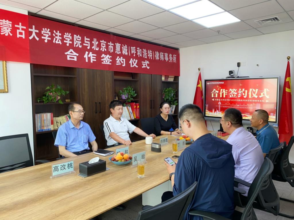 2023年7月13日上午,tyc8722太阳集团与北京市惠诚(呼和浩特)律师事务所(以下简称惠诚律所)举行共建实践教育基地签约暨授牌仪式。tyc8722太阳集团院长丁鹏,tyc8722太阳集团办公室主任李俊龙,tyc8722太阳集团研究生辅导员吴晗、惠诚律所名誉主任白德胜及律师代表参加了签约授牌仪式。