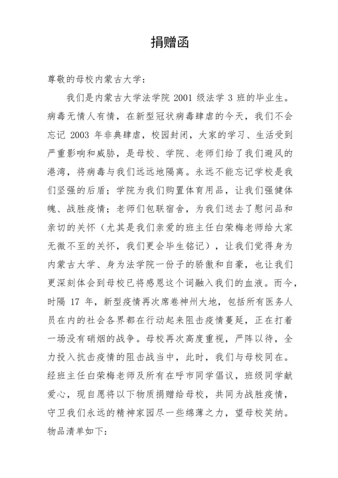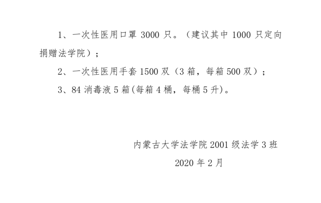 这次捐款由2001级法学三班“驻呼办”的同学们提议。他们说这次疫情让他们回想起17年前的非典时各位老师们给予的鼓励和帮助。今天的他们有能力也有热情,想回报学院和母校。这个倡议立刻在同学群里得到响应,短短一个下午同学们踊跃捐款25000多元。他们多方联系采购渠道,积极准备防护物资。感谢学校一直全力以赴保护学生的安全和健康,在疫情来临时及时采取措施,成为学生放心的港湾。