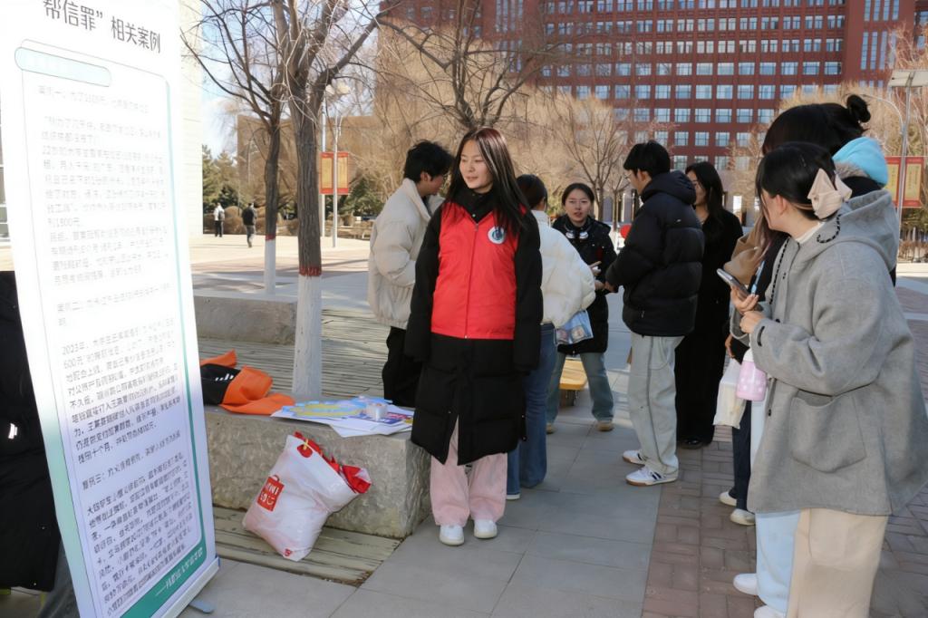 为深入践行学雷锋精神,普及法律知识,进一步提高同学们对帮助信息网络犯罪活动罪的识别与防范能力,3月5日14:30,tyc8722太阳集团于玉泉校区东院食堂门口小广场开展了“学雷锋·传法治·护青春”专题普法宣传志愿服务活动,以实际行动传承雷锋精神,传递法治温暖。
