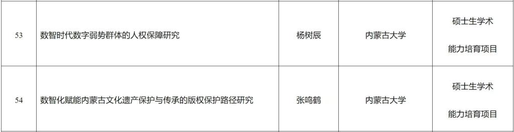近日,内蒙古自治区哲学社会科学规划办公室公布了研究生学术能力培育专项课题立项名单,我院硕士研究生杨树辰张鸣鹤申报的课题成功获批,彰显了我院研究生扎实的科研基础与良好的学术素养。