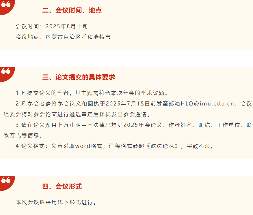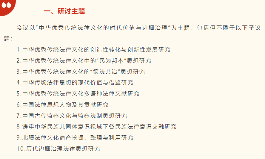 泱泱中华,法治文明源远流长。在全面依法治国的新时代背景下,深入挖掘中华优秀传统法律文化的思想精髓,系统阐释其时代价值与现实意义,既是传承中华法系精神命脉的必然要求,更是推进国家治理体系和治理能力现代化的应有之义。值此中国法律思想史专业委员会2025年会召开之际,我们以"中华优秀传统法律文化的时代价值与边疆治理"为主题,诚邀海内外专家学者齐聚北疆青城,共襄学术盛举。