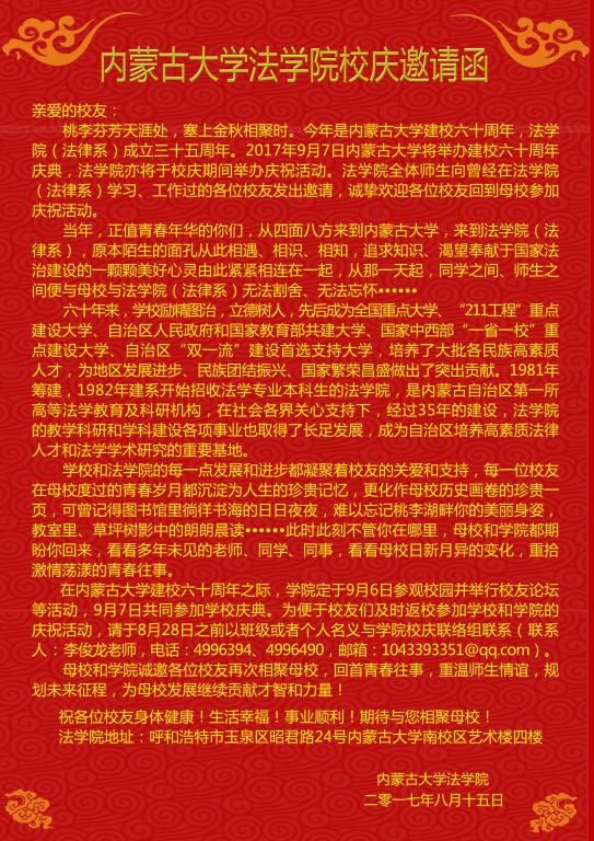 桃李芬芳天涯处,塞上金秋相聚时。今年是太阳集团城娱8722建校六十周年,tyc8722太阳集团(法律系)成立三十五周年。2017年9月7日太阳集团城娱8722将举办建校六十周年庆典,tyc8722太阳集团亦将于校庆期间举办庆祝活动。tyc8722太阳集团全体师生向曾经在tyc8722太阳集团(法律系)学习、工作过的各位校友发出邀请,诚挚欢迎各位校友回到母校参加庆祝活动。